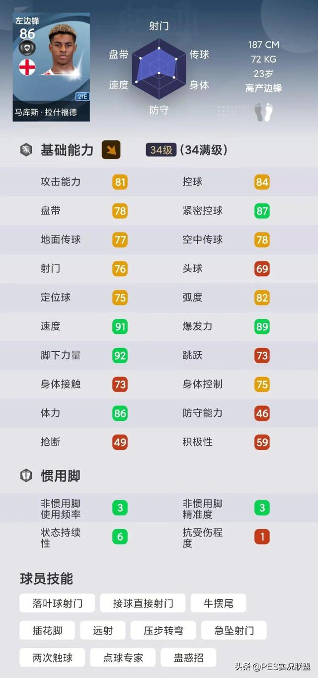 球员简析:E状态的拉什福德虽然大概率仍有90左右的双速,但攻击和射门精准度直线下降,连带着盘带和传球也不具备任何优势,整体水平显然还不如很多状态良好的金球实用。