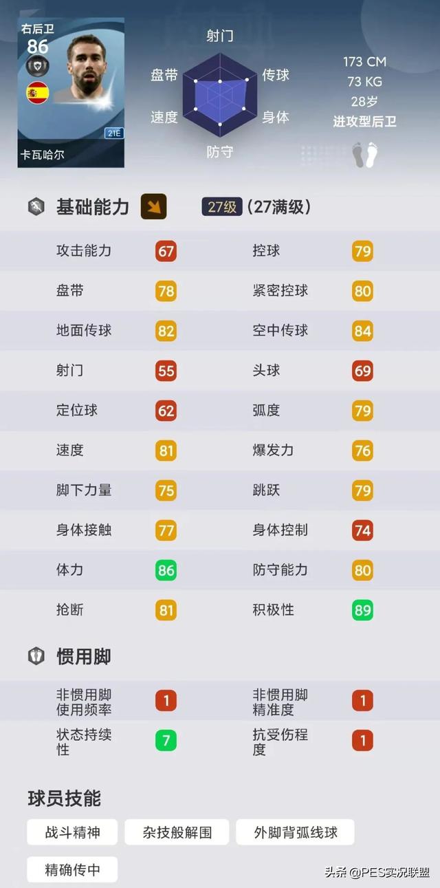 球员简析:D状态的卡瓦哈尔攻防两端的数据都严重拉胯,既没有速度也缺少必要的防守能力,除了积极性仍然很高之外,其余关键属性全部处于低迷水平,如果不想被对手打穿边路,本周还是选择雪藏为妙。