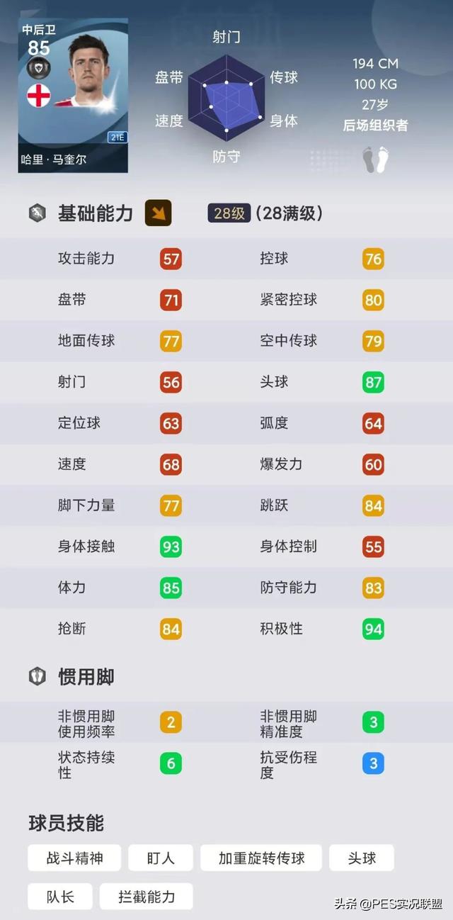 球员简析:D状态马奎尔的满级数据还不如C状态的1级数据给力,此时的他双速不足70,身体控制不足60,不仅转身慢、启动慢,而且防守也将形同虚设,再让他出场无异于在防线上立了一根木桩,除了可以充当人形标志物之外,似乎很难再有其它作用。