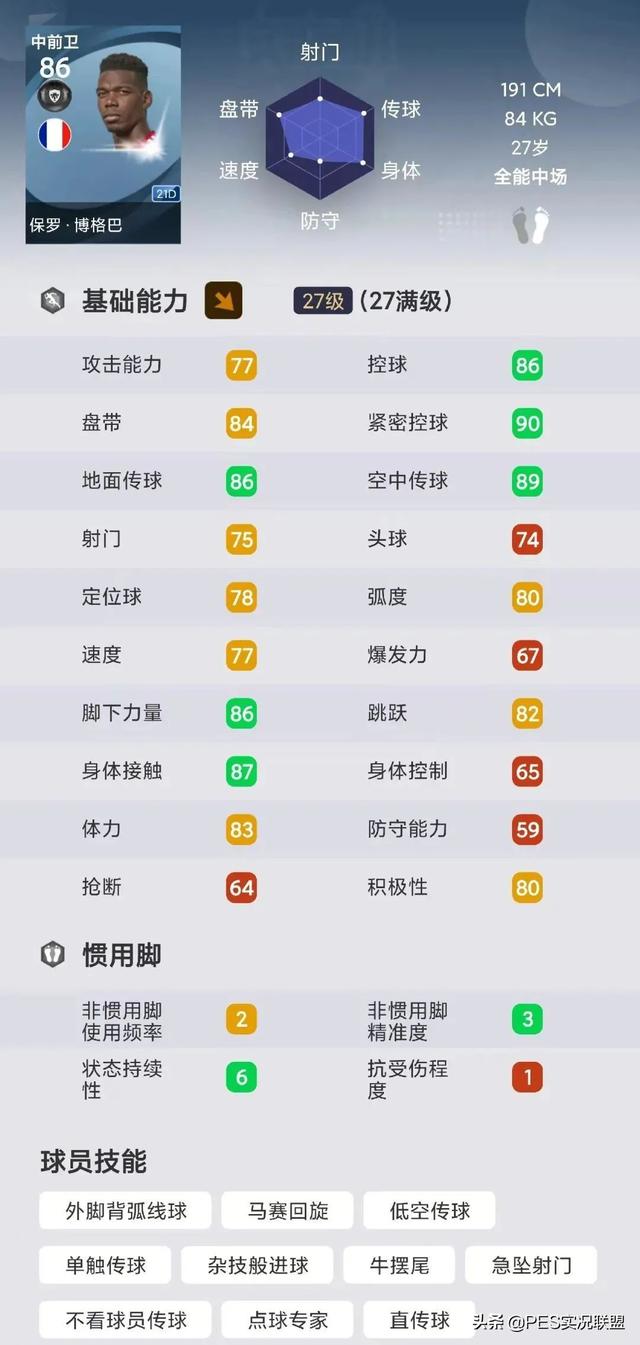 球员简析:博格巴本周基本算是废了,↘状态下的满级属性还不如→状态下的1级属性给力。本身就防守属性就不强的他,在实时状态D的削弱下,不仅双速是轮椅级别,而且体力和拦截能力也很拉胯,除了可以放在仓库里落灰,本周似乎也没有其它用途了。
