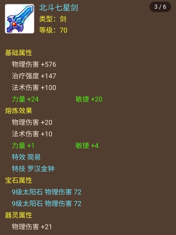 既然敢摆这么贵,肯定是有些“硬货”的,从藏宝阁上的截图来看,这把“北斗七星剑”显得很不一般。基础属性方面:物理伤害+576、治疗强度+147、法术伤害+100;至于绿字部分则为:力量+25、敏捷+24,咱先不说其他方面,就属性来说,这就是一把质量很高的69级物理武器,一方面物伤挺高,另一方面力敏双加不仅可以增加输出,同时又能提升人物速度,非常适合当前版本;然而,如果只是这样肯定不敢摆12W,下面的蓝字相当关键。