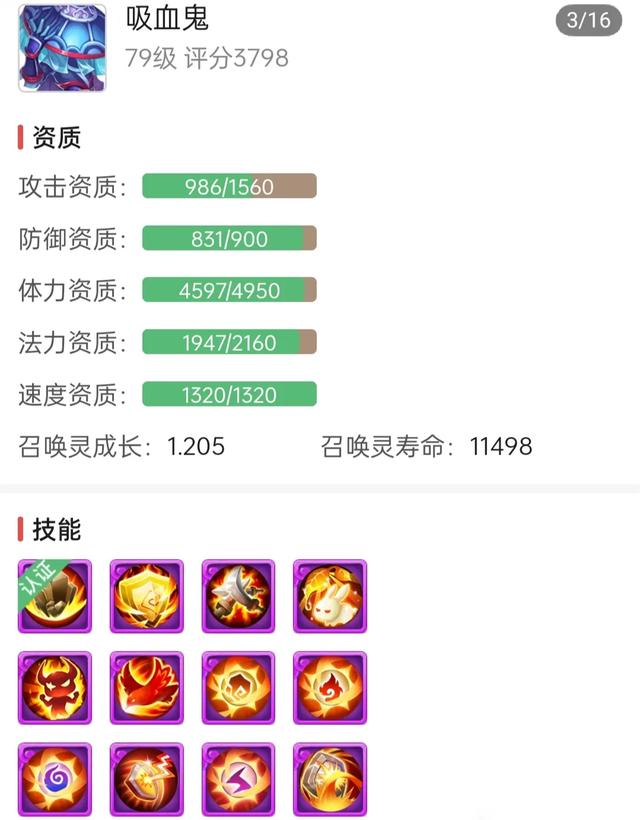 楼主在逛藏宝阁时偶然看到了这只配速吸血鬼,防御资质831,体力资质4597都算是很不错了,速度资质1320更是直接达到了满值,同时成长值也有1.205,整体而言,这样的属性表现确实很亮眼,用来做配速召唤灵非常合适。