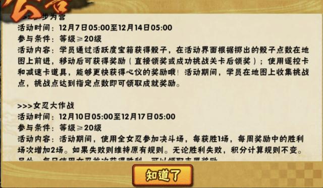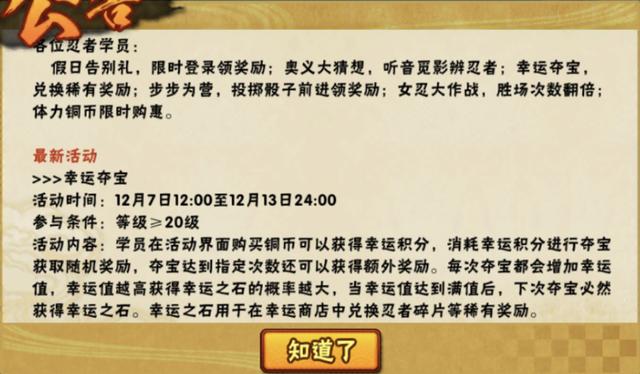 本周的更新公告里,基本上没有新鲜的内容出现,只有一个可以让新玩家快速招募旧忍者的活动“幸运夺宝”再次上架,其他的大家习惯就好。