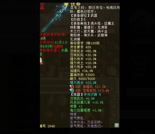武器估计大部分玩家都能够猜到,五阶仙器,蓝字克水23,炼器忽视风6+风狂暴16.1,2个8级宝石也是相当给力。