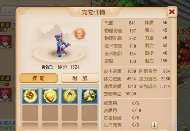 在主宠方面所搭配的是一只4技能千年僵尸,从1089的攻击资质、4504的体力资质、2080的法力资质、984的防御资质与1.114的成长值来看,这是一只刚用金柳露洗炼出来的胚子,并且在技能方面所携带的也都是自身所拥有的技能。选择用这只宠物来合宠,看来这名玩家想要尝试能否合出一只能够打造“永动机”的胚子。