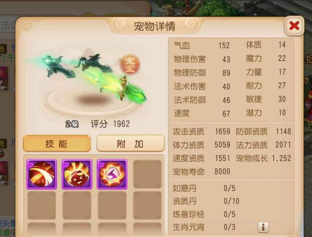 所搭配的是一只3技能鬼剑,拥有的1659点攻击资质、1148点防御资质、5059点体力资质,相比于属性上限都有着一些差距,而1.252的成长值也不是太高,如果选择与上一只千年僵尸合宠,无法拥有较高的合宠资质范围。并且这只鬼剑的技能也不多,相比于满技能胚子来说足足差了两个技能,用来实在是有些“跌份”。