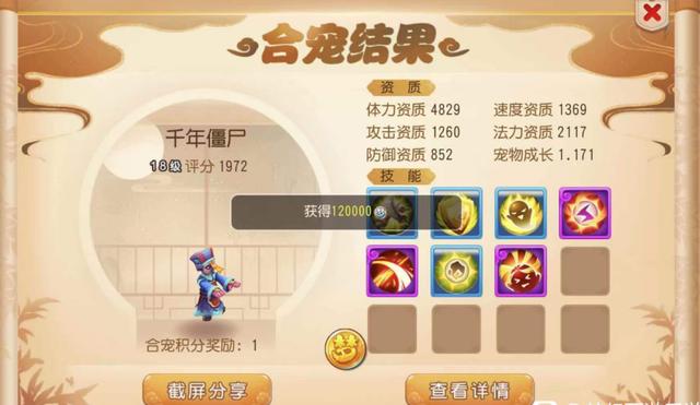 楼主这一次4+3成功地拿下了1积分奖励,所合出来的是一只7技能千年僵尸!看到这个结果,真是为楼主感到既开心又遗憾。所开心的是这一手合宠运气爆发,得到了7技能的结果;而遗憾的是,如果这一手选择5技能鬼剑合宠,并且打掉千年僵尸的必带鬼魂技能,则有大概率合出10技能结果!
