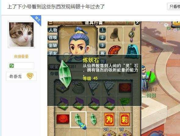号上有一个45级的炼妖石,这种等级的炼妖石在现在已经算是绝版的东西了,那时候梦幻西游的金创药也比现在贵很多,号上的装备都没有凑齐,那时候没有灵饰。