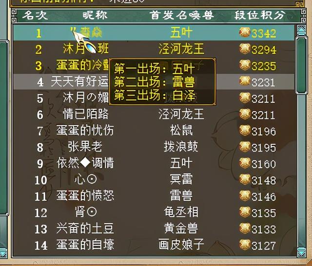 来看一下某服务器单人比斗排行榜前几名是被哪些召唤兽占据呢?一般占据排行榜前几名的召唤兽,不是神兽就是一些比较变态的宝鉴宠,对于普通玩家来说,还是看看别人的比武视频好了,一般的普通玩家比斗不至于专门去打造一只或者几只神兽,像排行榜前几名的玩家,有专门为单挑、比斗而特殊打造的召唤兽,满灵犀全攻五叶就是其中的一个例子,另外还有一些像有玩家为了应对比斗,直接打造出一只大力白泽,这类宝宝站桩嘎嘎好用,不过,平民玩家似乎没有那么大的投入。于是,大家还是找一些其他抗揍的站桩召唤兽为妙。本着实惠好用的出发点,一心觉得下面这几只宝宝,对平民玩家比斗来说是不错的选择,哪几只呢?我们来看看吧。