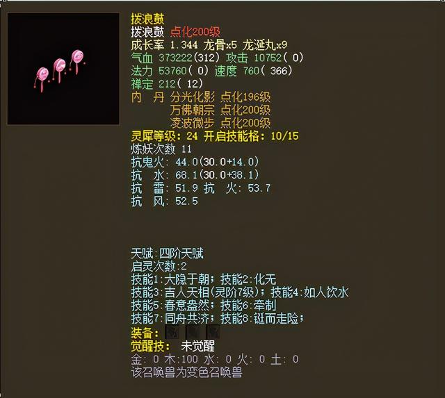 孟极鸾女这些咱们先姑且不提,毕竟这类宝鉴宠不是每位玩家都有的配置。说到比较常见、比较合适比斗的宝宝,拨浪鼓是其中之一,拨浪鼓这个宝宝有一个神奇的技能,可以有效降低自身受到伤害,虽然说这个技能每回合只能用一次,而且是几率触发,但是吃上人族内丹点过攻击灵犀后的拨浪鼓,打起人来丝毫不含糊,尤其是安排上觉醒技一帆风顺,分分钟把对手带回老家。