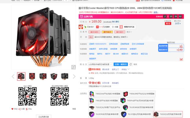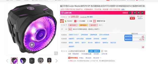 所以我选择了稍微贵一点的酷冷至尊暴雪T620 RGB,今年618期间价格在150元左右。配有6热管直触,散热能力有保障。