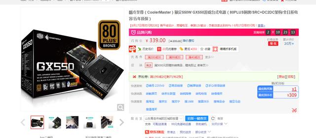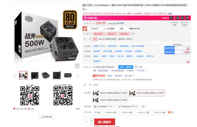 根据我们选择的处理器(3500X,满载功耗150W)和显卡(GTX 1050Ti,满载功耗132W)来看,选择一款350W 的电源就已经足够使用了,但是由于酷冷至尊 战斧500W的电源价格太香了,不仅有80Plus 铜牌认证,还有三年质保,更是只要169元,所以下单这款电源自然是最好的选择。