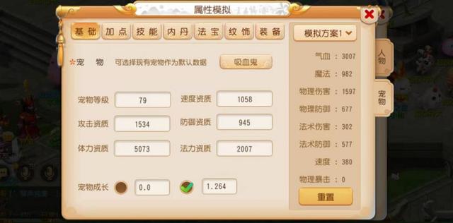 大家都知道在人物满65级时便可以携带吸血鬼参加战斗,因此精锐组的玩家对吸血鬼也是情有独钟,碰见极品更是求之不得。在模拟了这只宠物达到79级属性后,就连灵儿也彻底惊呆了,物理伤害达到了恐怖的1597,并且气血值也有3007,这种强悍的属性都快赶上精锐组大唐的面板了,如果再配上专属内丹和专属宠物装备,那简直就是无人可挡的存在。