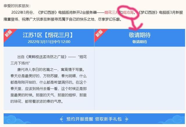 大家看了三月份将要开启的服务器了吗?虽然在明面上就要开启了服务器只公布了一个,也就是江苏一区的烟花三月,但是在介绍中策划却不小心暴露了另外的一个服务器,那就是观沧海,那就是观沧海将会出现在哪个大区内?