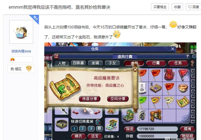 这位玩家是个狠人,不仅用师徒任务刷出来的善恶点跑宠环白赚一本项链书,又跑去口袋版专门挑些成本低廉的东西玩。就例如这个精囊,一口气拿了15个,接连开出高级魔兽要诀魔之心,后面还出了颗金刚石。15万的成本换来的是3000万,直接翻了200倍。