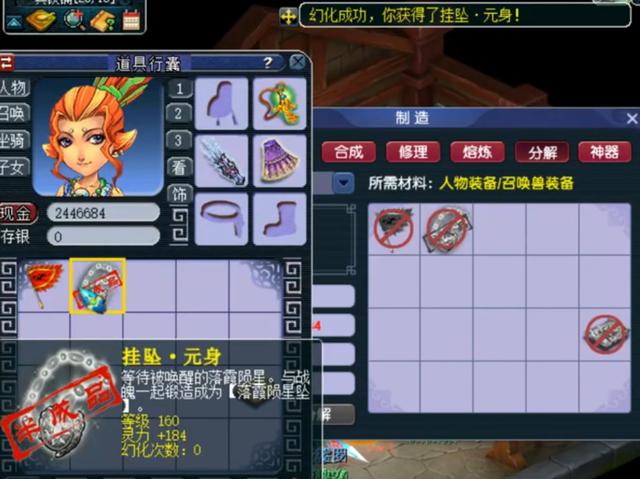 很多土豪玩家在鉴定完160级的装备后,并不会想着已低价1000、2000万的价格去售卖,而是选择直接分解成陨铁。按理说低价卖不是更划算吗?却发现,这分解竟然能分解出元身,尽管概率很低很低,但还是有几率出现的。陨铁还能留着自己继续使用。这位玩家就是,分解160项链时给了件元身,经过几轮幻化后,眼看属性还行就拿去打造。