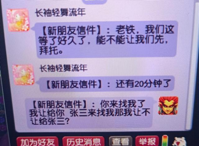 在五行斗法任务场景中大家都是需要靠手速去抢的。但是某些人却认为刷五行斗法的时候是需要排队的,上面的这位玩家就碰到了这么一位。对方找上面这位玩家的目的是为了让上面的这位玩家等一下,因为对方的任务时间只剩下20分钟了,再抢不到怪物任务就要失败了。如果你是上面的这个玩家,你会让对方先刷吗?