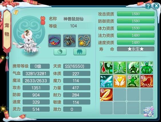 这样的白金小老鼠,还带有一丝粉色,颜值还真是不错。技能上,有了神兽内丹,带高强力高吸血高强壮高神,走的是三维攻宠路线,在99级达到3000血和380个速度,外加1577的攻击,虽然面板较为一般,但有高审判作为克制技能,在面对有高神的宝宝的时候伤害还是很可观的,说不定能一套带走呢!