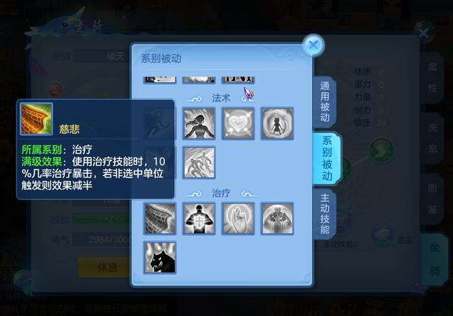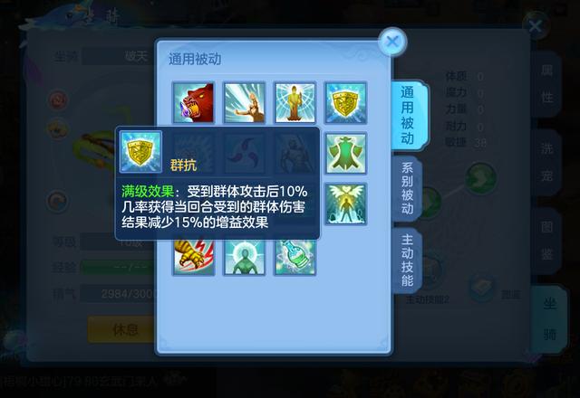 坐骑技能分为三种,被动技能、系别被动、系别主动。被动技能小编推荐大家选择"群抗",因为辅助门派的物理防御一般都比较高,但是法术防御相对较低,群法里面包括很多的法术伤害,一旦触发能有效地减少所受伤害。系别被动技能一般是佛门选择慈悲,普陀选择普度,慈悲可以加强佛门本来就相对强势的单回合回复能力,普度则可以为普陀有机会增加一个治疗单位,有效的解决了普陀单回合回复相对较少的问题。至于系别主动技能大家可以根据自己的情况选择,各自都有擅长的地方,总之一切都是为队伍中的核心输出提供便利。