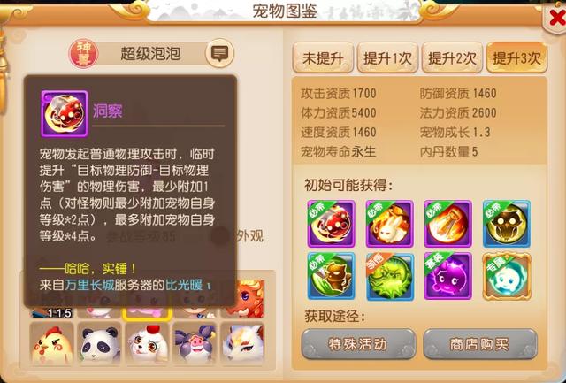 因为超级泡泡所携带的洞察专属技能有着输出方面的优势,在进行物理攻击时可以临时提升“目标物理防御-目标物理伤害”的物理伤害,尤其是针对怪物最少附加宠物自身等级*2点,所以在战斗中针对非物理系单位造成的伤害非常恐怖!