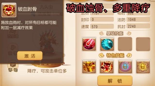 技能[狞恶]辅助效果是,在施放技能同时有概率对敌方一个单位追加法术普通攻击,优先作用于被降疗的单位,并附加一层降疗效果。同时技能[九头之恶]可以使得血雨命中敌方单位越多,伤害变得越高。技能[破血跗骨]施放血雨时,对所有目标都可能附加一层减疗效果,算是一个另辟蹊径的技能吧,不过小九感觉用处并不是太大。