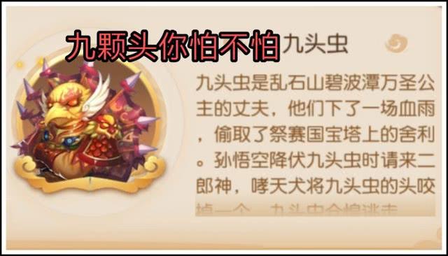 大家好,我是九命,欢迎来到九命的《梦幻西游手游》助战详解之九头虫!九头虫是乱石山碧波潭万圣公主的丈夫,他们下了一场血雨,偷取了祭赛国宝塔上的舍利。孙悟空降伏九头虫时请来二郎神,哮天犬将九头虫的头咬掉一个,九头虫仓惶逃走。手游中的九头虫打底如何呢,据说在手游中他一直是一个执着于鞭尸的奇葩法系哦,到底情况如何呢?我们一起来看看吧!