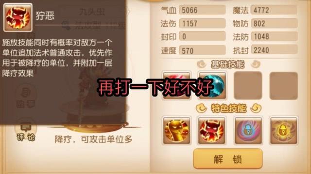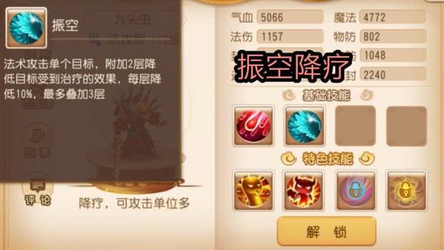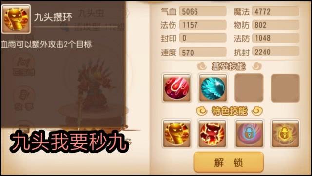 综合属性上来讲并上没有特别出彩的属性,但是速度在纯粹的法系输出中是一个亮点,九头虫的速度可以压制除了魔方寸、魔女儿、魔化生以及万圣公主以外的所有纯粹输出法系,在玩家对战中有着非常好的效果。