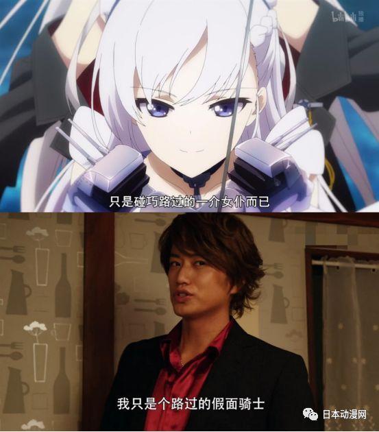 同样,舰装的变身总会或多或少的牵扯到特摄的层面,比如企业号的变身姿势,那个动作其实有点致敬老牌特摄《宇宙刑事卡邦》变身的意思。而且动画版的编剧,他曾经还写过《假面骑士铠武》的外传小说,你说没有私货我是不信的。另外第二话最后贝尔法斯特出场时,面对瑞鹤“你是谁”的质问,贝尔法斯特回复的是“碰巧路过的一介女仆而已”,这句话实际上恶搞了《假面骑士DCD》中帝骑哥的经典台词。