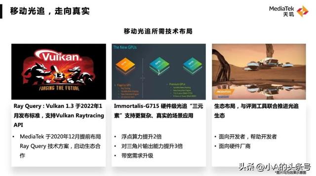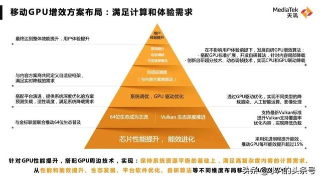 显然,在智能手机SoC性能不断提升时,能效已成为了事关用户体验的焦点问题。在积极推动光追落地的同时,联发科提出的移动GPU增效方案,让人看到了尽快实现手机光追商业化应用的可能。联发科移动GPU增效方案,是一个金字塔式的方案布局。从芯片性能提升、软件和API生态(64位、Vulkan)、系统调优、自适应调度再到GPU增效算法,层层递进,从而有效地为CPU、GPU降低负载,减少功耗、控制发热,最终提升用户的使用体验。