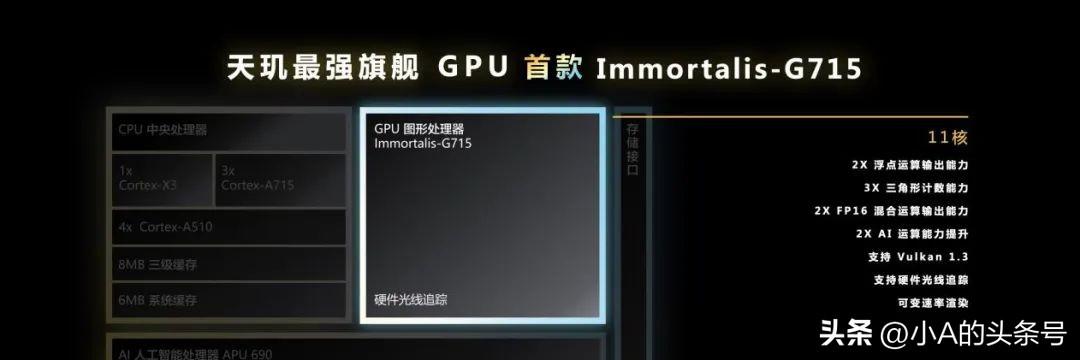 目前实现光线追踪主要有两种方式:一个是光线追踪实时渲染,模仿真实光线的传播行为,相对的,由于需要实时计算光线反射,重复计算量大,对硬件性能有着非常高的要求;另一个是光栅渲染,查出画面中哪些像素需要渲染,然后用GPU按需要对像素渲染计算即可,在同一时间里只要计算一次,但涉及到算法和内存管理的问题更加复杂。实际上,早前《遇见逆水寒》、《天谕》等手游也以软件方式,直接使用GPU的通用计算单元来实现光追,不过要使手游真正用上光追,平台化才是最终归宿,现在PC上支持光追的游戏大多是两种渲染技术混合实现,相辅相成。这也是为什么移动端要实现光追,软硬件的协调如此重要。Immortalis-G715之所以引人注目,关键在于,它是业界首款支持移动硬件光线追踪的移动端GPU方案,它和Mali-G715最大的区别是,增加了专门负责光追的管线,可像RTX那样通过硬件光追内核加速。一直与Arm紧密合作的联发科显然首先受益。最新一代的联发科旗舰芯片天玑9200的GPU此次就采用了Arm Immortalis-G715方案,并将GPU规格提升到了MC11。与前代产品相比,它具备了2倍的浮点运算性能、3倍的三角形计数能力、2倍的FP16混合运算能力,以及2倍的AI运算能力。和天玑9000相比,天玑9200的GPU性能提升了32%,GPU巨大的提升是移动光追的底层基础,很显然联发科与Arm对提升未来手机游戏的画质达成了某种共识。
