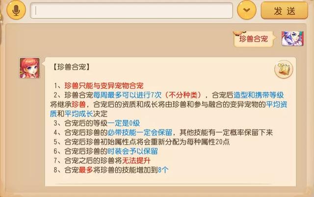 珍兽和神兽资质一样,都可以进行3次提升,并且每提升一次资质就会增加珍兽的最低携带等级,这个地方需要大家多多注意,要选择适合自己等级段的珍兽。在技能方面珍兽与神兽有所区别,神兽为绑定的3个技能和2个自由打书的技能,而珍兽则是它可以通过合宠将技能提升至8个,不过珍兽只能与变异宠物合宠。而且每周最多只可以进行7次,合宠后所有的技能与属性都将继承在珍兽的身上,绑定技能不会消失,玩家们可以放心的打造属于自己的珍兽。