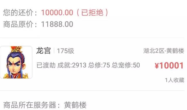 一个175级的龙宫账号,该玩家摆出的原始价格是11888元,而买家想还价一万元进行购买,不过当该玩家看到卖家修改之后的价格也是懵了,1887都还下来了,怎么连最后一块钱却还不下来了呢?有网友笑称,多卖一块钱是想告诉买家,还价并不是那么容易的。还有其他网友觉得:卖一万和一万零一块的差距可大了,当别人问卖了多少钱的时候可以自豪的说卖了一万多,总比直接说卖了一万块钱有面子多了!