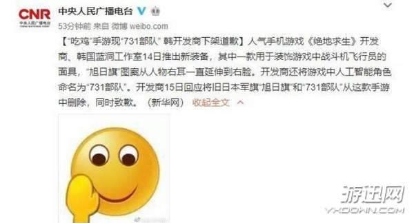韩国手游事件经过上周六,PUBG公司在手机游戏中发布了一个试验性的面具活动,同时游戏中加入的智能(AI)游戏机器人使用了“731部队”这样的代号。这些装备和代号一经曝光就引起了许多韩国游戏玩家的争议,他们认为这“太阳旗”是第二次世界大战期间日本帝国主义的标志,是对包括朝鲜、中国在内入侵战争罪行的象征。731部队则是臭名昭的日本化学武器、生物武器研究部对的代号,此部队对中国及周边各国人民都犯下的暴行罄竹难书。