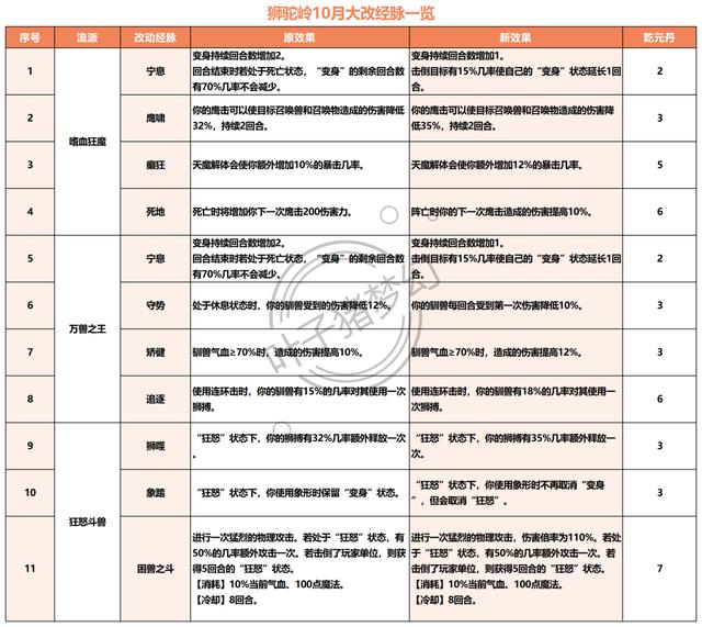 狮驼岭的三个流派在本次大改中都有了明显的增强,虽然“嗜血狂魔”、“万兽之王”的变身回合被缩短,但其拥有了一个全新的BUFF,只要“击倒目标”就有“15%的几率”将变身延长一回合,非常给力。此外,“嗜血狂魔”还加强了鹰击能力,将此前提供的“200点伤害力”转变为“鹰击伤害提升10%”,这就意味着狮驼岭伤害越高,点这个经脉带来的加成也就越舒服。