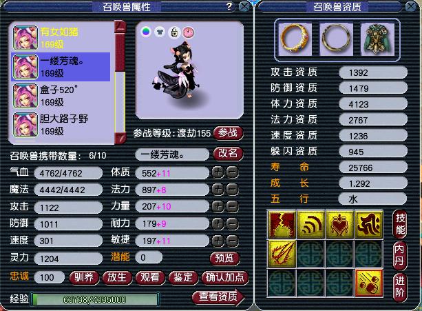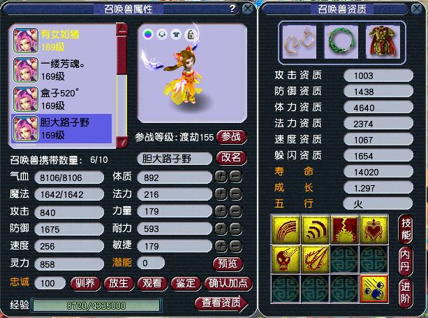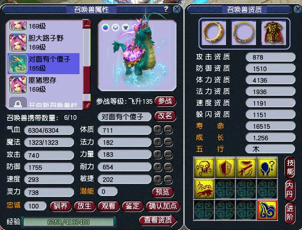 召唤兽一共有6只,除了一只是龙龟,其它都是进阶猫灵,全红须弥法宠以及壁垒攻宠都有了。