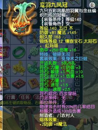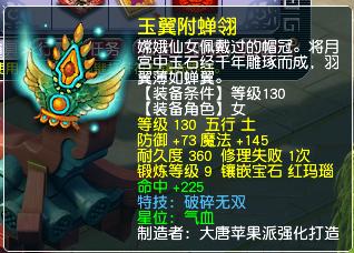 破碎无双特技女头盔一件,140级12段装备,点化巨蛙套装效果。