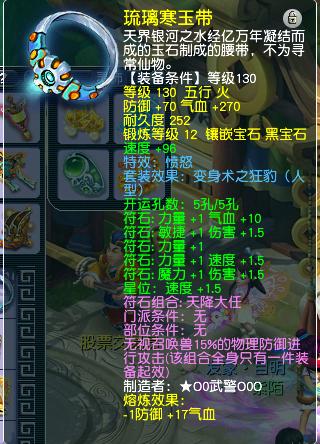 130级愤怒腰带一条,点化狂豹变身术套装效果。