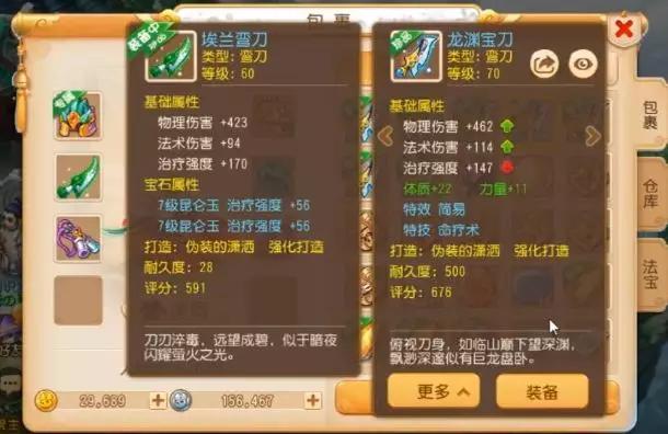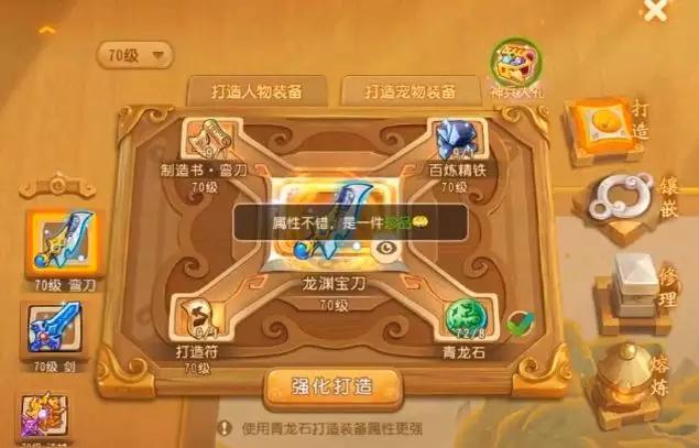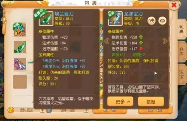 当当当!来了来了!简易它来了,它带着命疗术和绿字力体双加来了!果然,小伙伴们都是要么不出,一出就是极品,这把70级的龙渊宝刀真配得上宝刀这个称号,简易这个特效在卡级玩家中就是一个无敌的存在,可以降低装备的使用等级,以便大家镶嵌更高级的宝石,60级的武器只可以镶嵌2个7级的宝石,而70级的则可以镶嵌2个9级的宝石,战斗能力大大提高。这把龙渊宝刀带的命疗术则是消耗愤怒回复己方单体9%+600点气血,一个非常强力的辅助技能,要说唯一美中不足的地方就是它的双绿字了,不是敏捷力量而是体质力量,稍微歪了一点,但是问题不大,不妨碍这是一把极品武器的事实。