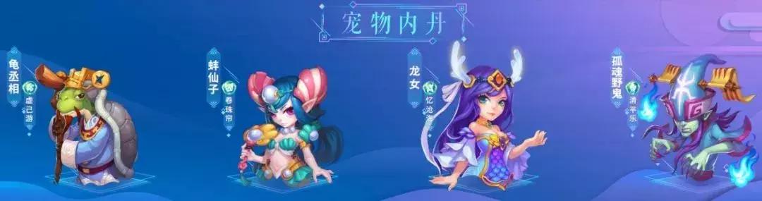 龟丞相学习专属内丹虚己游后,将减免对方与自己速度差相关的物理伤害结果。蚌仙子学习专属内丹卷珠帘后,将减少自身一定比例的速度,强化作为龟速血宠的地位。龙女学习专属内丹忆沧海后,自身释放水漫金山、水攻时将额外提升伤害结果。孤魂野鬼学习专属内丹清平乐后,回合开始时如果是己方唯一造型,则临时增加自身一定法术伤害结果。