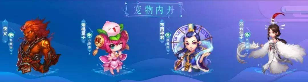 夜叉学习专属内丹九幽囚后,在攻击宠物单位时,将有概率给目标附加鬼魂术技能,持续到战斗结束。这个内丹将非常具有战术性,可能覆盖掉对方宠物的神佑复生。蟠桃童子学习专属内丹万寿喜后,每存活3回合,在回合结束时会给主人回复自身法术伤害相关的气血。布雨神君学习专属内丹覆云雨后,自身释放水系法术时将额外提升伤害结果。羽云仙子学习专属内丹九天舞后,物理攻击速度低于自己的目标时,将额外增加一定物理伤害结果。