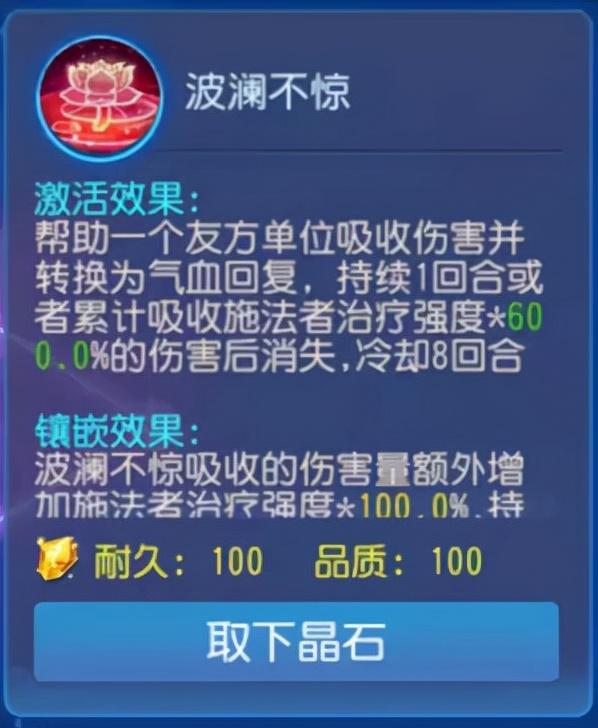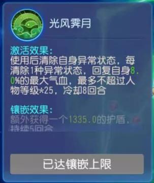使用后清除自身异常状态,每清除一种异常状态,回复自身8.0%的最大气血,最多不超过人物等级*25,冷却8回合。