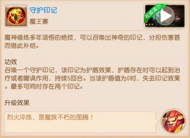 召唤一个守护印记,该印记为护盾效果,护盾存在时可以起到治疗或者嘲讽作用,持续5回合。当该护盾值为0时,失去印记效果。最多可同时存在两个印记。