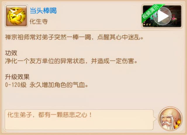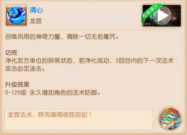说明:这些技能和水清诀等特技类似,都会有个净化或者清除异常状态的功能。不过需要注意的是,龙宫清心、化生当头棒喝,由于速度的原因,后续一般不会再有辅助门派提供治疗,所以需要召唤灵使用三药及时顶血。