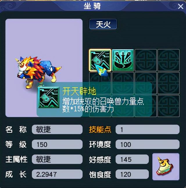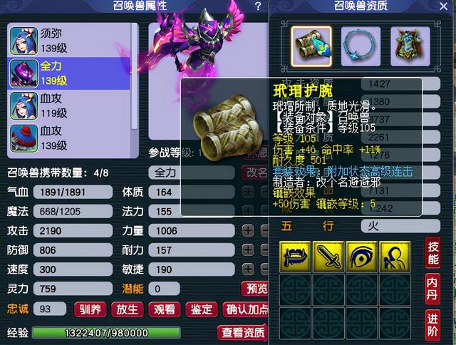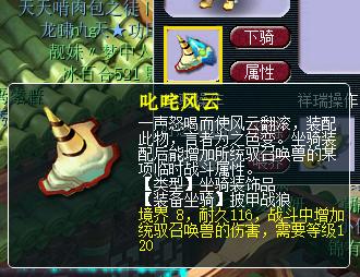 再就是坐骑饰品推荐加伤害的、加灵力、加速度的,一定别忘记统御召唤兽,不骑乘的坐骑统御召唤兽对召唤兽也有效果,对人物没有效果。所以推荐多弄几只坐骑,每个号最多6个坐骑。