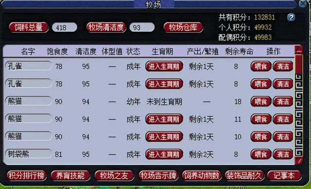 现在的牧场被削了一次又一次,不过还是推荐大家搞一下,可以不养动物直接收购积分换储备,现在1周只能换300W储备了。现在熊猫窝不好繁殖,经常断窝,我转成走兽专精了,养树袋熊,不断窝,每周还能剩窝卖掉。
