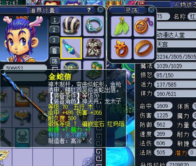 这个时候他还展示了自己的武器,一把70级的不磨武器,玛瑙已经打满了,现在伤害为266点,命中是486点。然后附加了敏捷和魔力,都是加了7点。力天宫用这样的武器,其实还是挺不错的。
