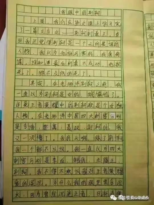 有学生写《我眼中的荆轲》中透露,一直以为荆轲是女性,古代的四大刺客分别是李白、韩信、兰陵王、荆轲。