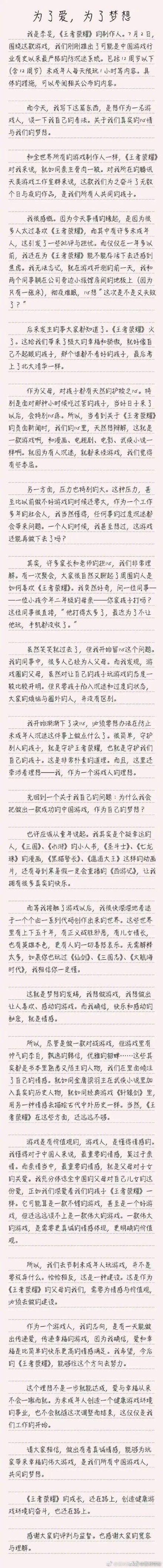 《王者荣耀》制作人发公开信