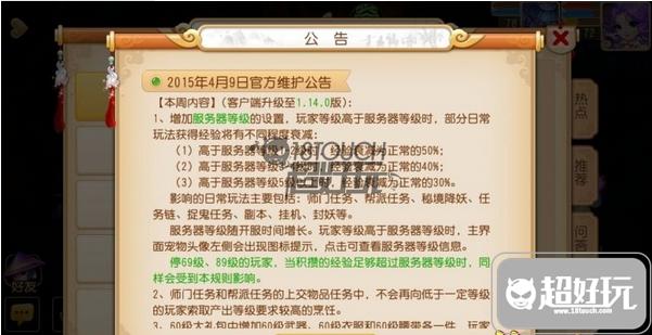 高于服务器等级1~2级时,经验衰减为正常的50%;高于服务器等级3~4级时,经验衰减为正常的40%;高于服务器等级5级以上时,经验衰减为正常的30%。也就是说,有了这个系统之后,一方面低级玩家可以快速跟上高级玩家,而处于衰减状态的高级玩家,也大可选择暂停升级,等到服务器等级上限开放之后再升级。
