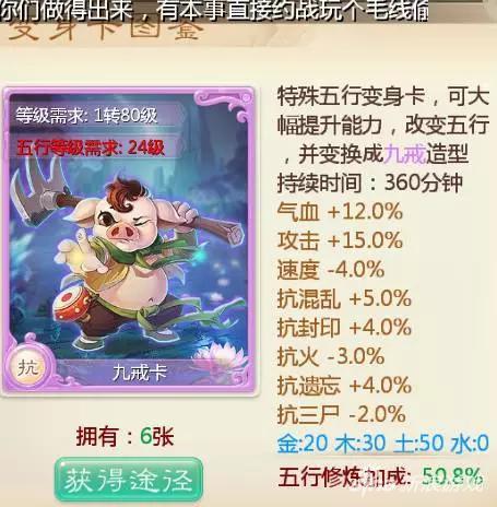 九戒卡,作为猪八戒的弟弟猪九戒也绝对是一个值得大众中敏魔期待的变身卡,高血量的加成比罗刹卡更给力,高抗性也不输罗刹卡多少,最大的优势在于只需要24级的五行就可以变身了,还有就是五行优势明显,虽然主属性土也占了50%,但是我想手游中给力的克土仙真的是少之又少的存在。比起罗刹卡最大的不足就是不加法量,而且还是负速度的,但是对于本身速度就不快的中敏魔来说绝对是无伤大雅的。所以综合评价来说还是一个非常 不错的中敏魔的大众变身卡。